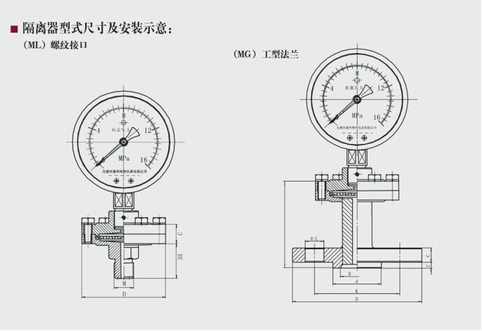 隔膜式壓力表由于采用間接測量結構,適用于測量粘度大、易結晶、強腐蝕、溫度較高的液體、氣體或顆粒狀流動(dòng)固體的壓力。隔離膜片有多種材料以適應各種不同腐蝕性介質(zhì)。